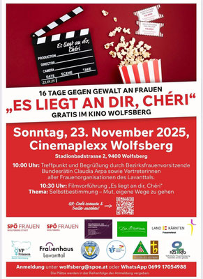 Im Rahmen "16 Tage gegen Gewalt an Frauen und Mädchen" fand am Sonntag, den 1. Dezember ein Kinomatinee in Kooperation mit dem Frauenreferat Land Kärnten und den SPÖ Frauen Wolfsberg statt. Frau Landesrätin Sara Schaar, Bundesrätin Claudia Arpa und die Obfrau der Beratungsstelle Frau Melitta Moser begrüßten die zahkreichen Besucherinnen im Cinemaplexx Wolfsberg.